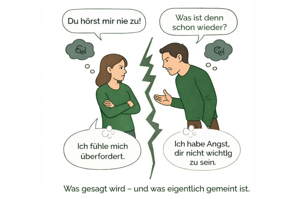 Was beide in dem Moment nicht aussprechen können: Die Partnerin fühlt sich überfordert und braucht eigentlich Nähe, traut sich aber nicht, das zu zeigen. Der Partner fühlt sich in dem Moment verletzt, wünscht sich Zuwendung und kontert das nur über Kritik.